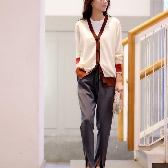 羽織るだけでこなれ感のある三色を使用したカーディガン。