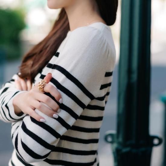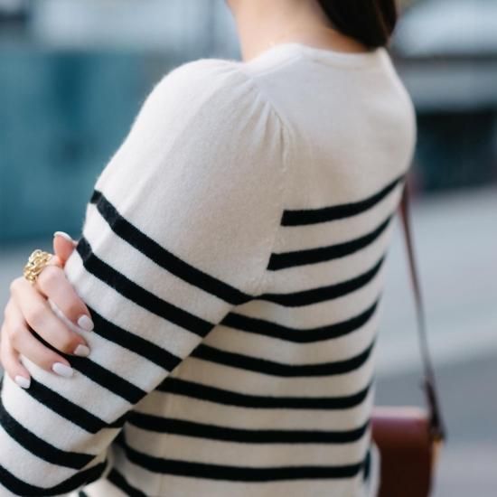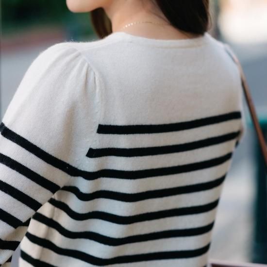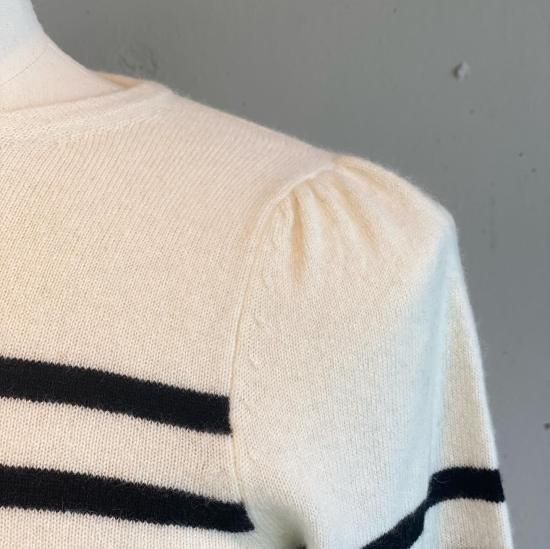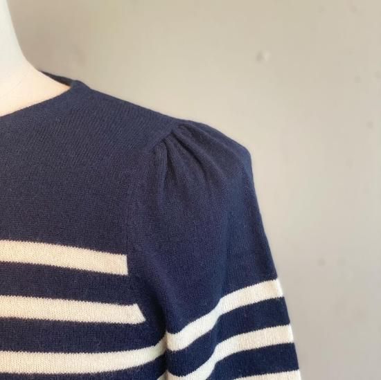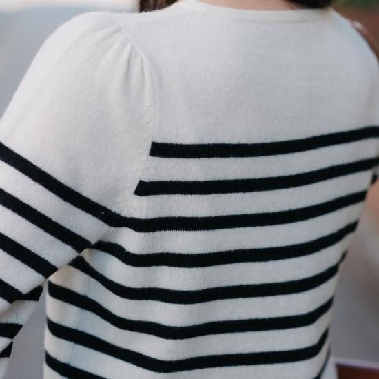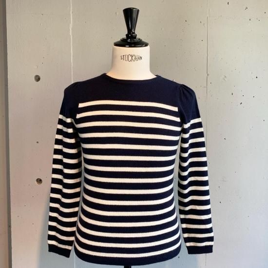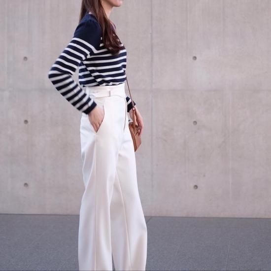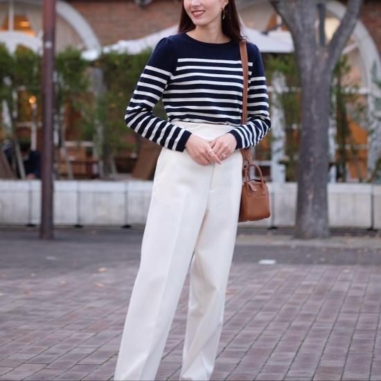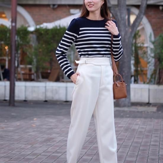 カジュアルになりがちなボーダーニットですが肩にタックを施し綺麗めな印象に。